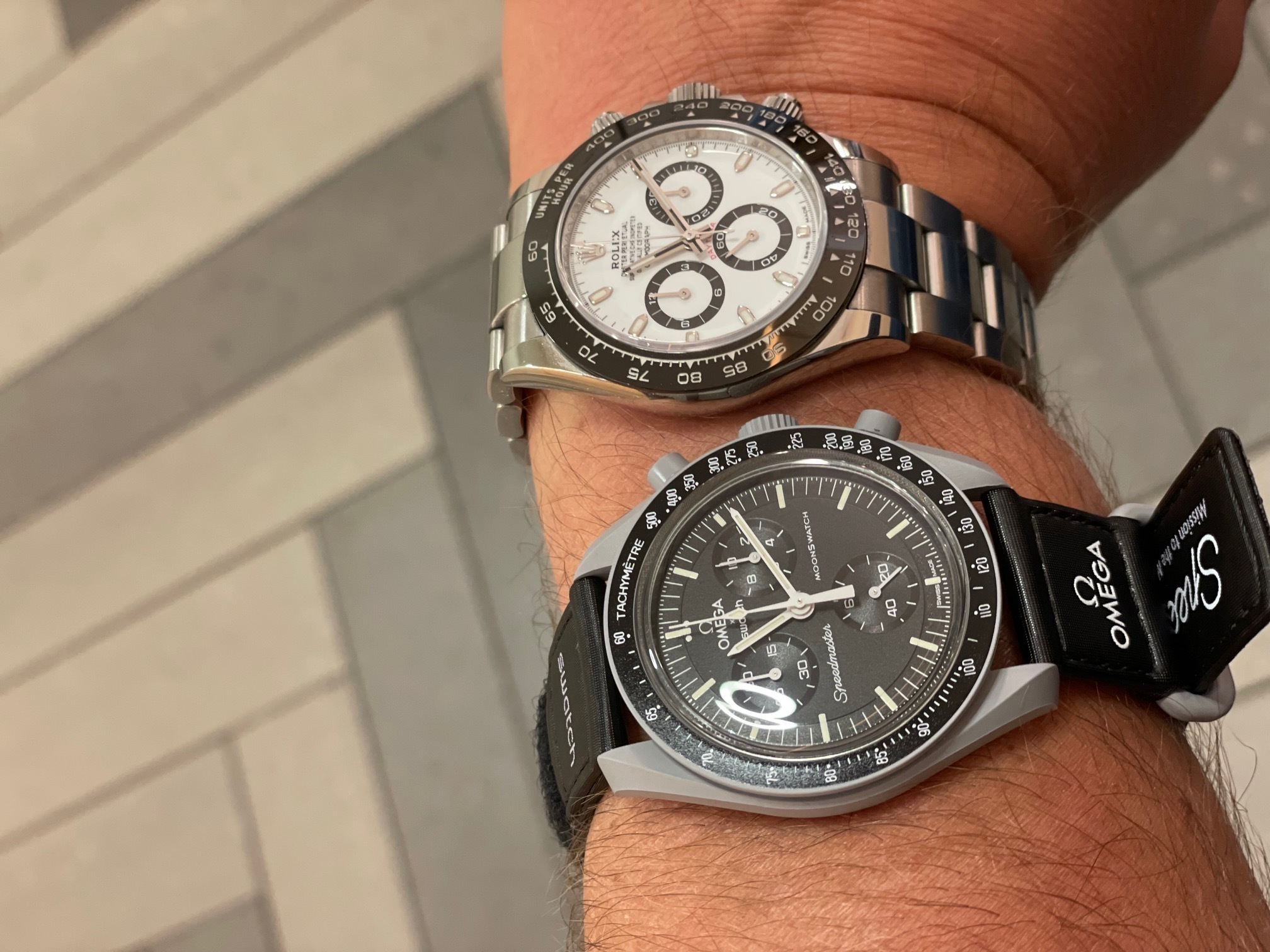 | | | | | | |  Mijn zoon (12) vanochtend blij gemaakt (vanwege zijn mooie eindrapport) met een Omega MoonSwatch die momenteel net zo lastig te bemachtigen is als een knappe Rolex. Onder het motto je moet ergens beginnen…