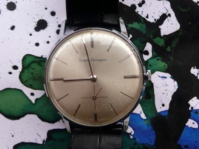 Het is een 34 mm dresswatch, handopwinder, uit +/- 1965. Na een paar dagen went dat wel! Het is een GP caliber 20, een gemodificeerde Peseux 330. Een behoorlijk plat caliber, 3.1 mm, tikgetal van 18.000.