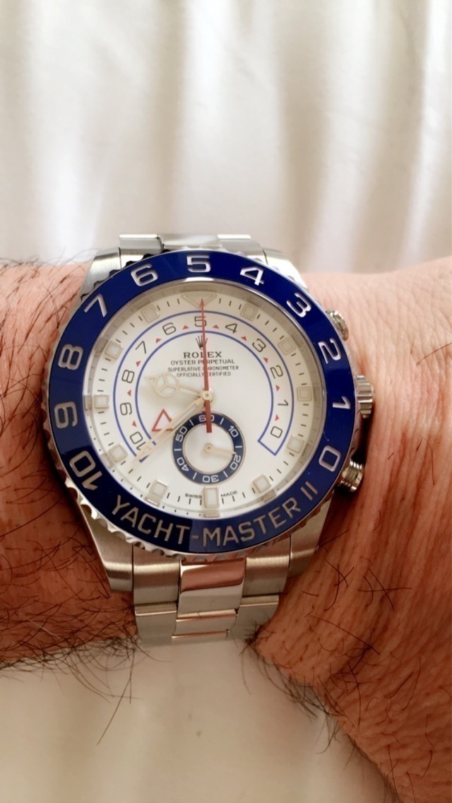 ***** Prachtige en unieke 116680 Yacht Master II.. Een tikkeltje "omstreden"...immers niet ieders smaak...in elk geval wel mijn smaak... Ik denk dat dit soort modellen trendsettend is voor wat Rolex in de toekomst gaat leveren. Eind januari dit jaar nog deze YM II kunnen kopen voor € 12.250,- (gebruikt/zeer goede staat) in de gediscontinueerde uitvoering "Blue Hands". Thans is een gebr./EU op Chrono niet meer voor minder te koop dan € 13.500,- (Marchal Watches-Maastricht/"vaste prijs") of € 13.995,- bij Kramer Watches-Franeker. Hij draagt verrassend comfortabel...ben er na vele jaren GMT en Kermit's erg blij mee en vind hem steeds mooier.
